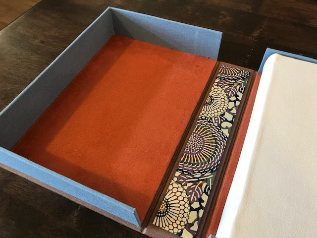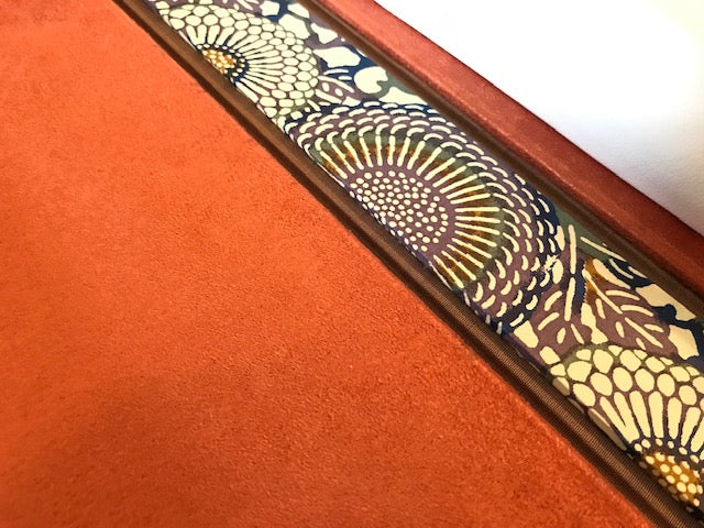 - Interior lined with copper orange suede cloth and spine piece covered in luxurious hand-printed Chiyogami Mum Navy Lattice paper