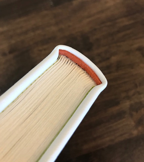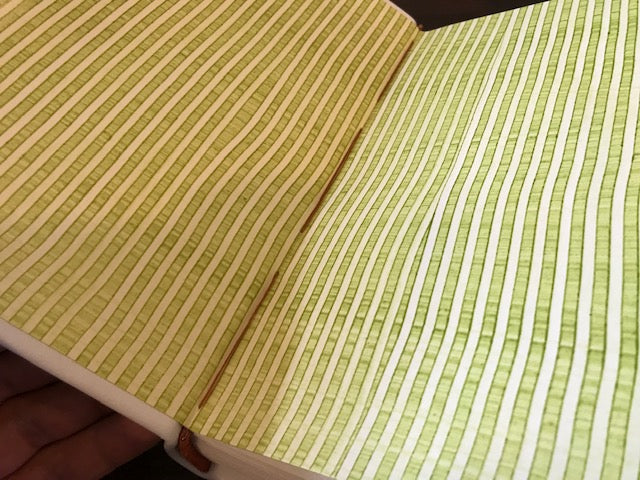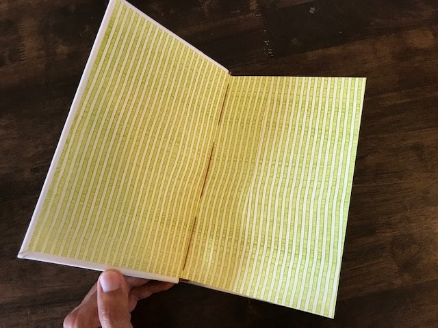 - Endpapers of unique handmade paste papers, sewn to the text block for extra strength