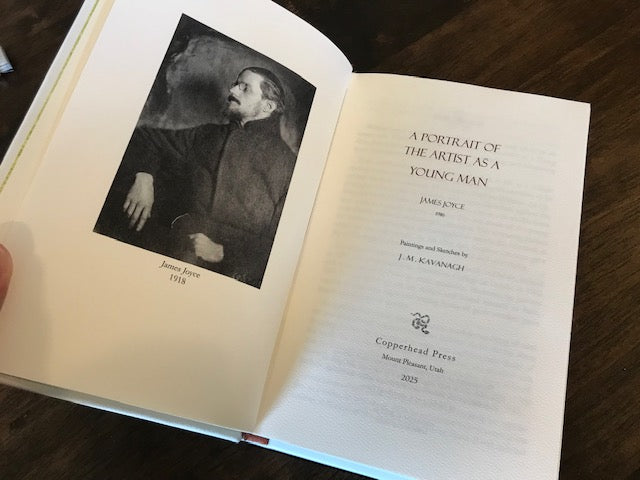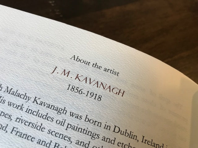 Inside, you will find 10 illustrations by Dublin-born artist Joseph Malachy Kavanagh, whose life coincided with that of James Joyce. Kavanagh was well known for his oil paintings and etchings, which capture coastal landscapes, riverside scenes, and other aspects of rural life in Ireland, France, and Belgium.