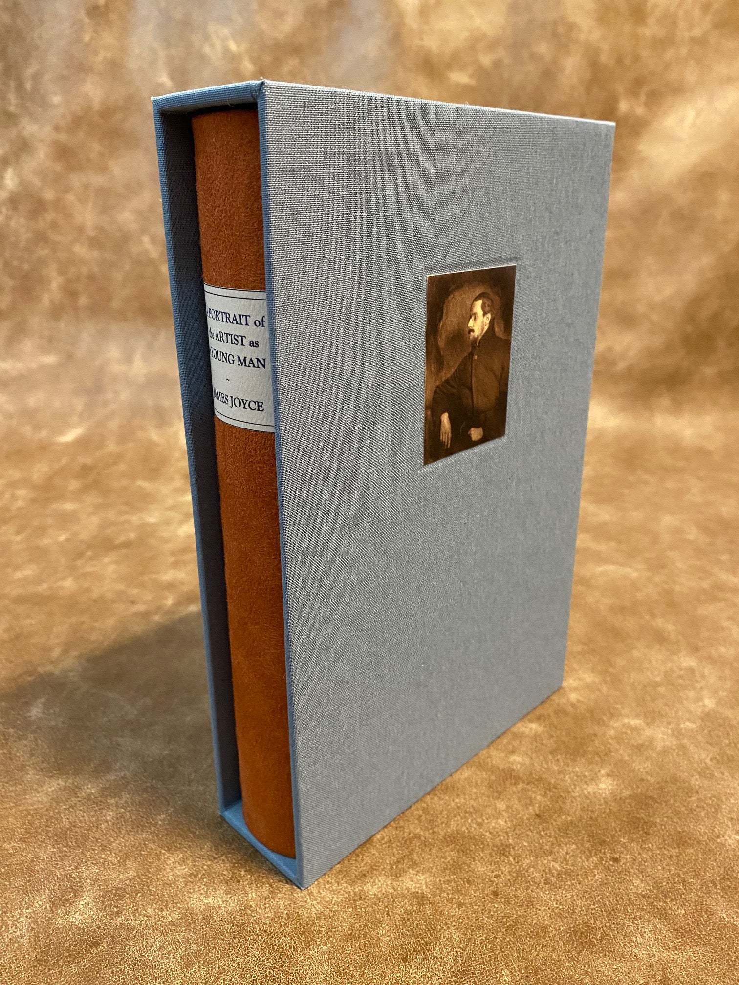 - Slipcase front: Features an early photograph of James Joyce printed on white felt paper