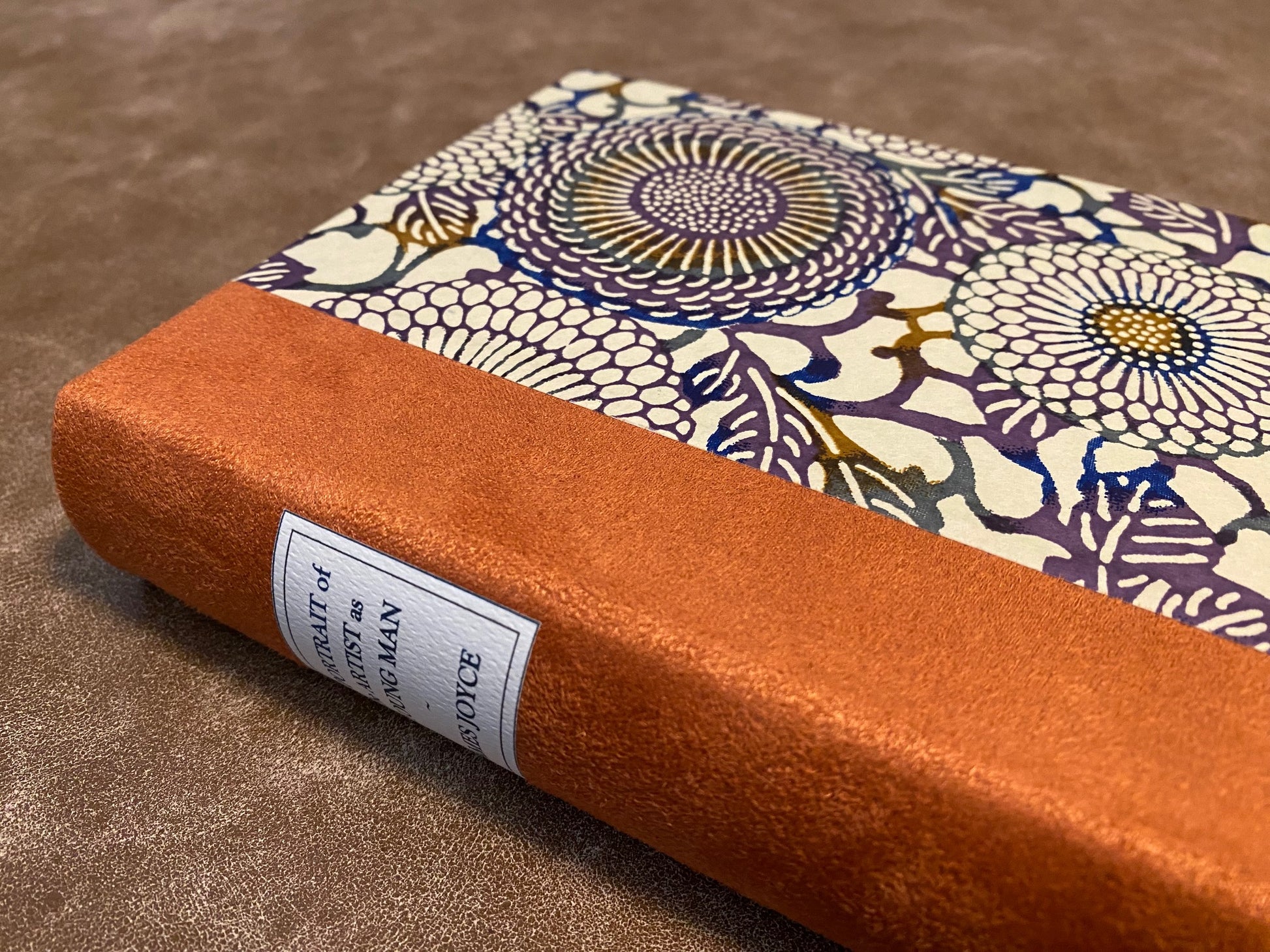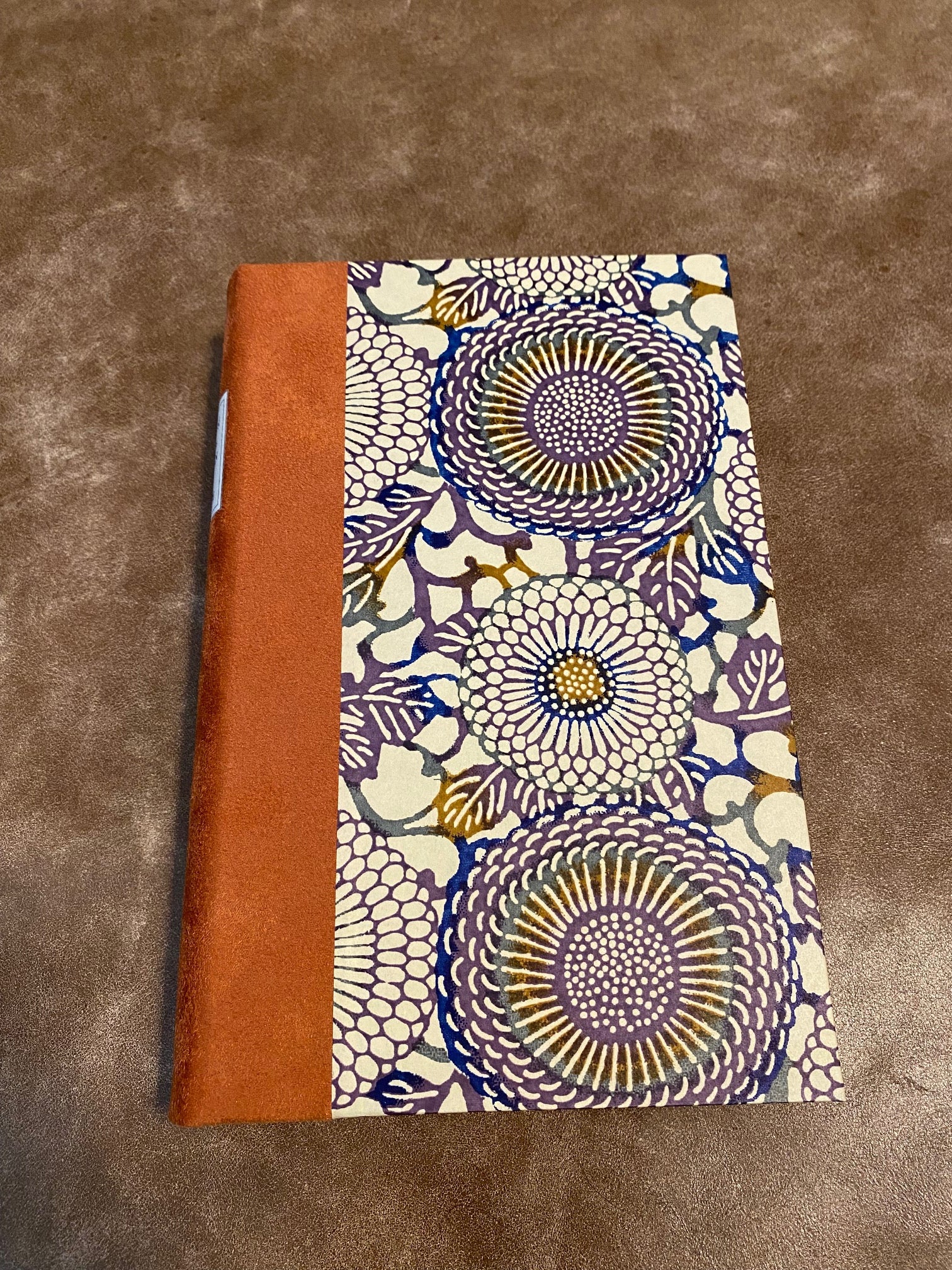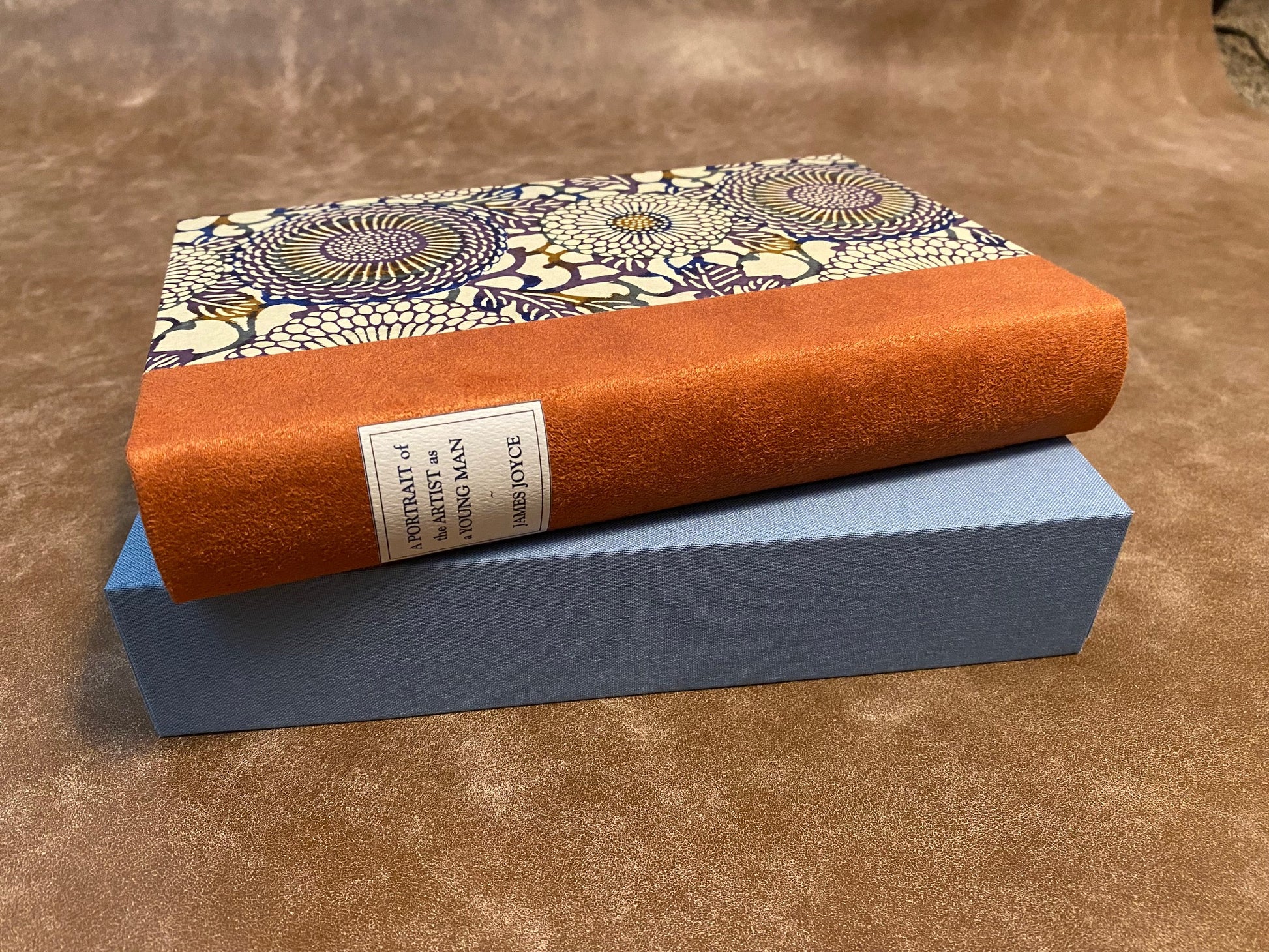 - Binding: Half-bound in heavy copper orange suede cloth