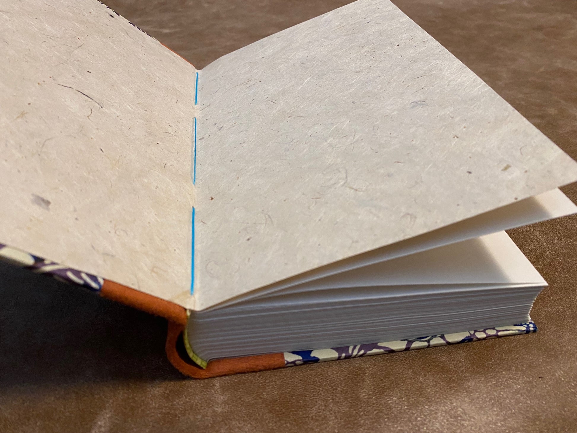 - Sewing: Hand-sewn with electric blue book thread