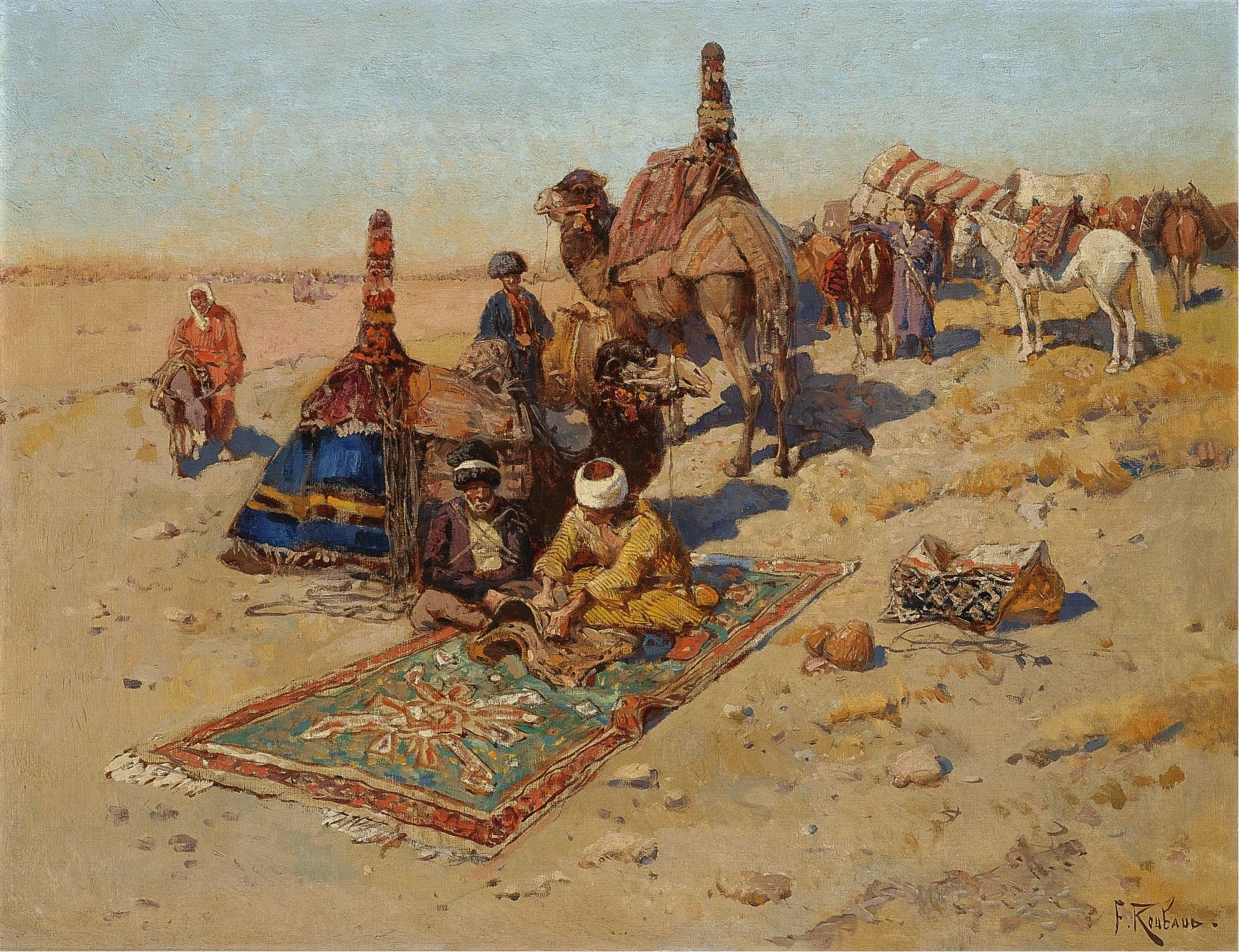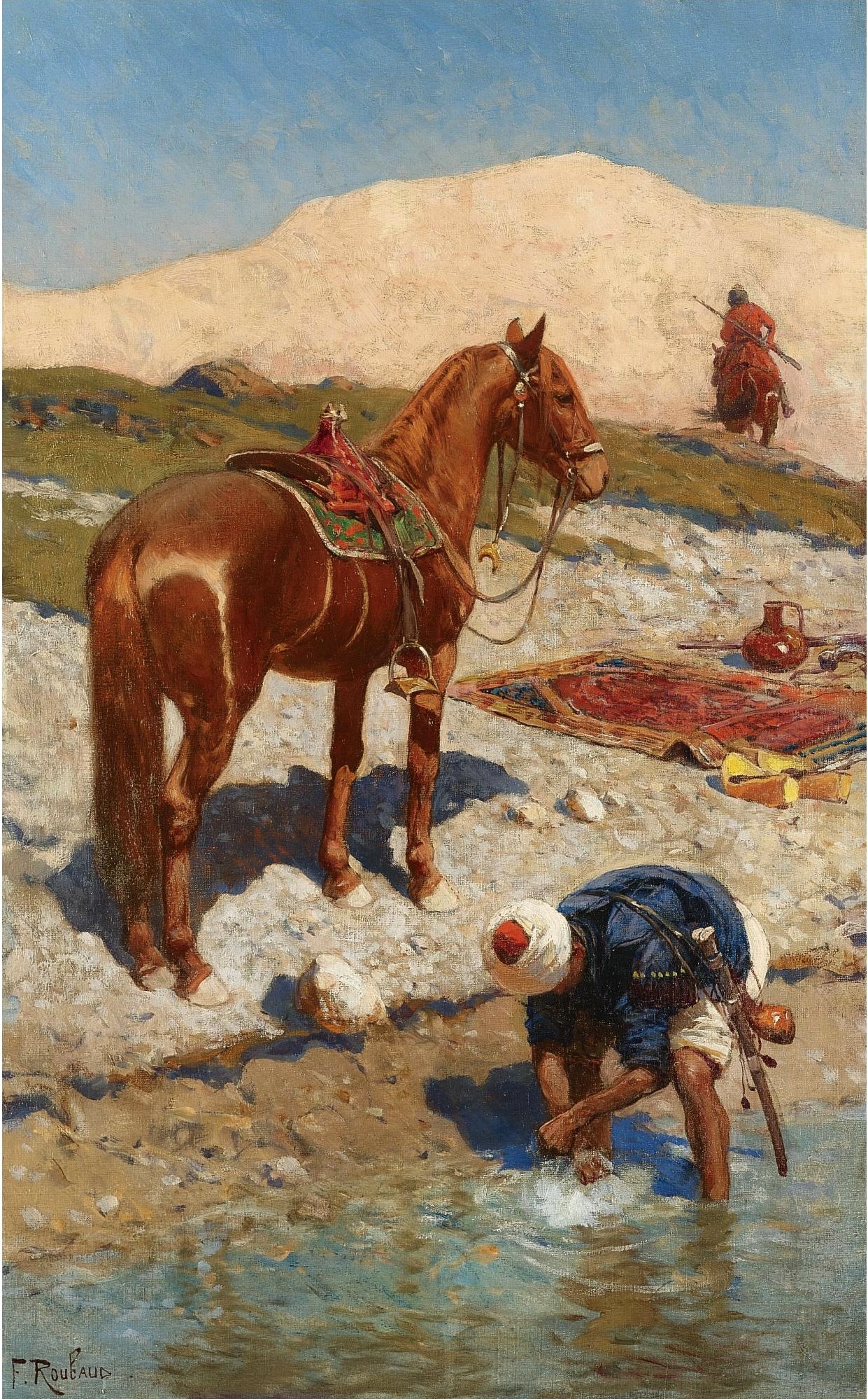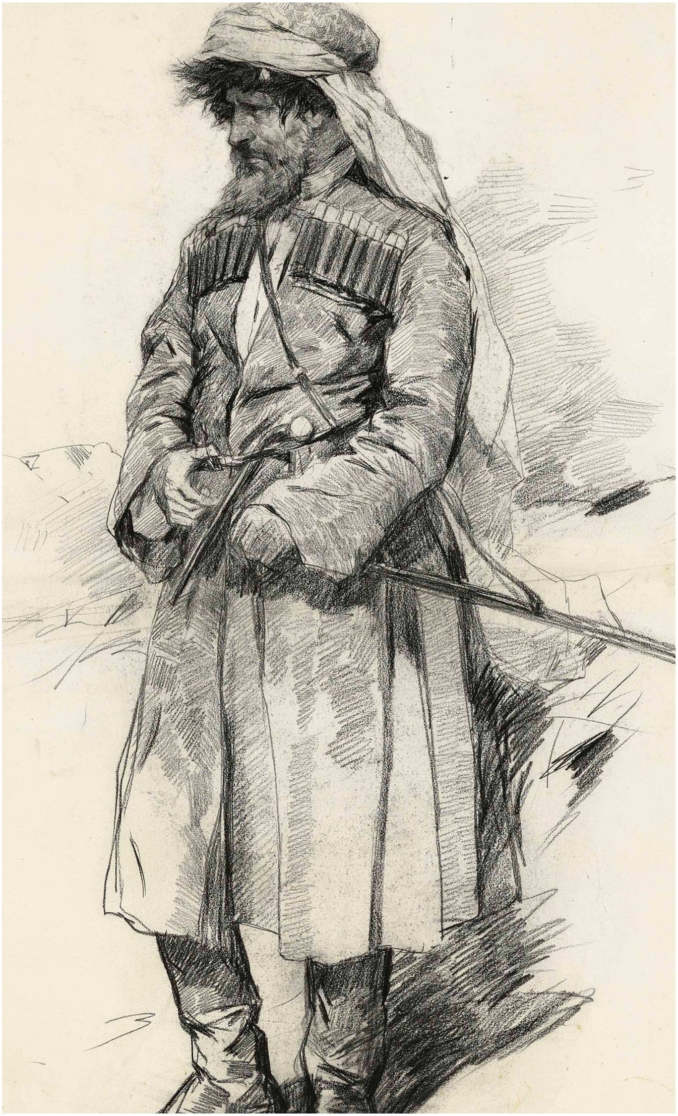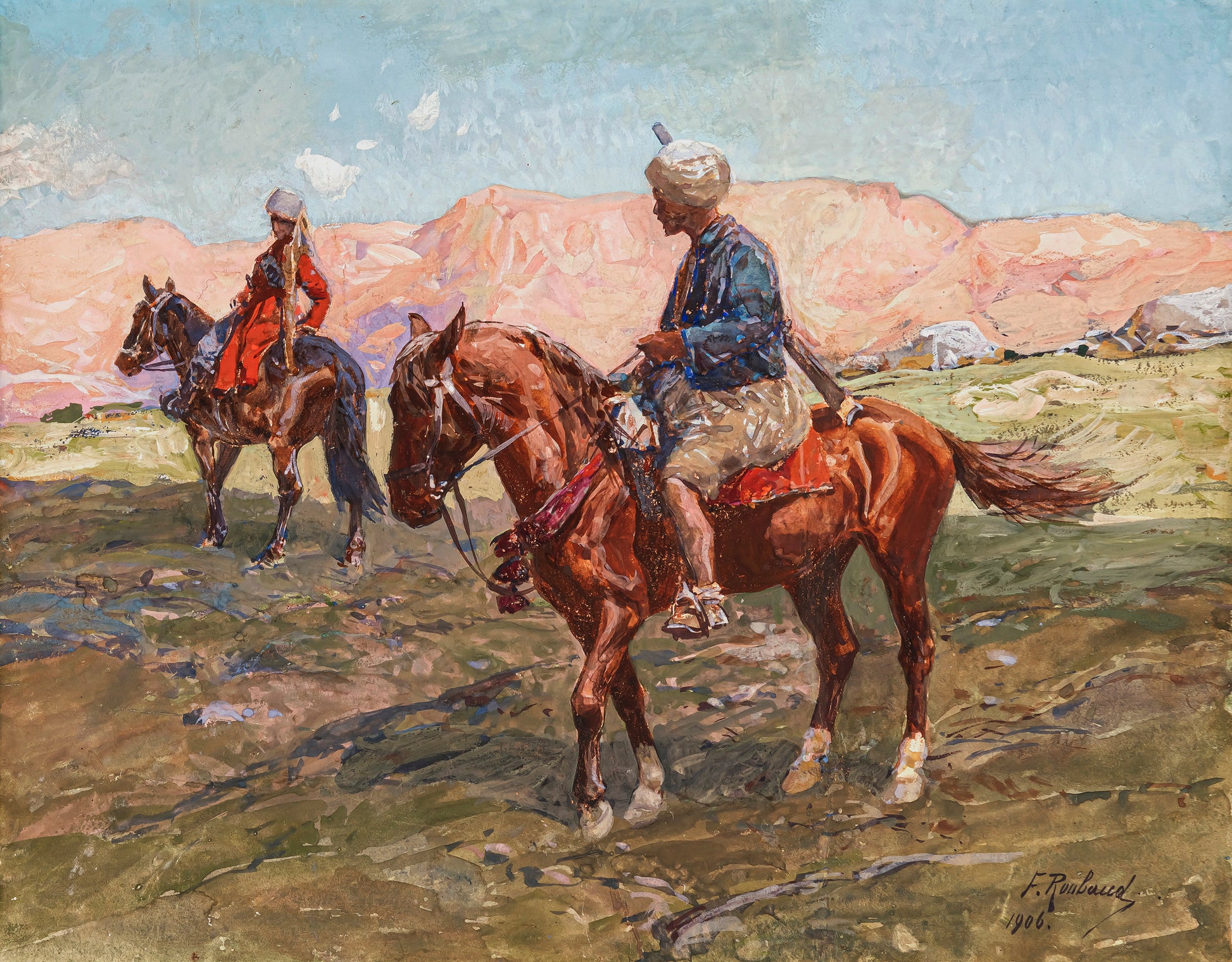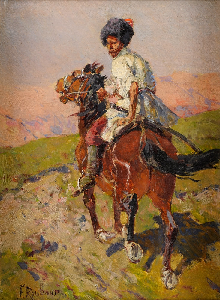 From 1904 to 1912, Rimbaud served as a professor at the St. Petersburg Academy of Arts. Over the course of his career, he became known for his vivid depictions of life among the Caucasian mountain tribes, often portraying Kyrgyz and Circassian horsemen. His work is a natural complement to Hadji Murad, offering a rich visual accompaniment to Tolstoy’s portrayal of the region and its people.