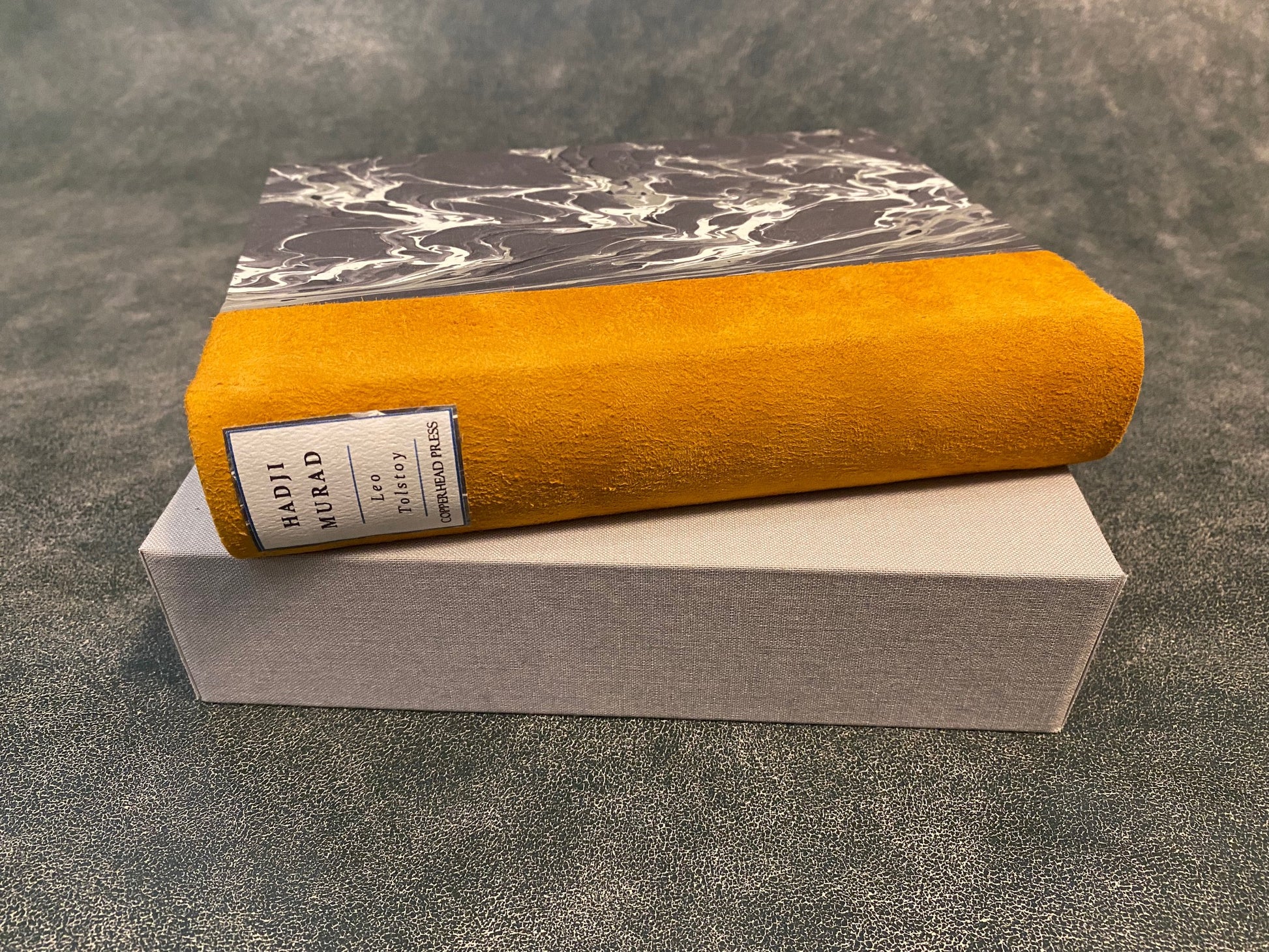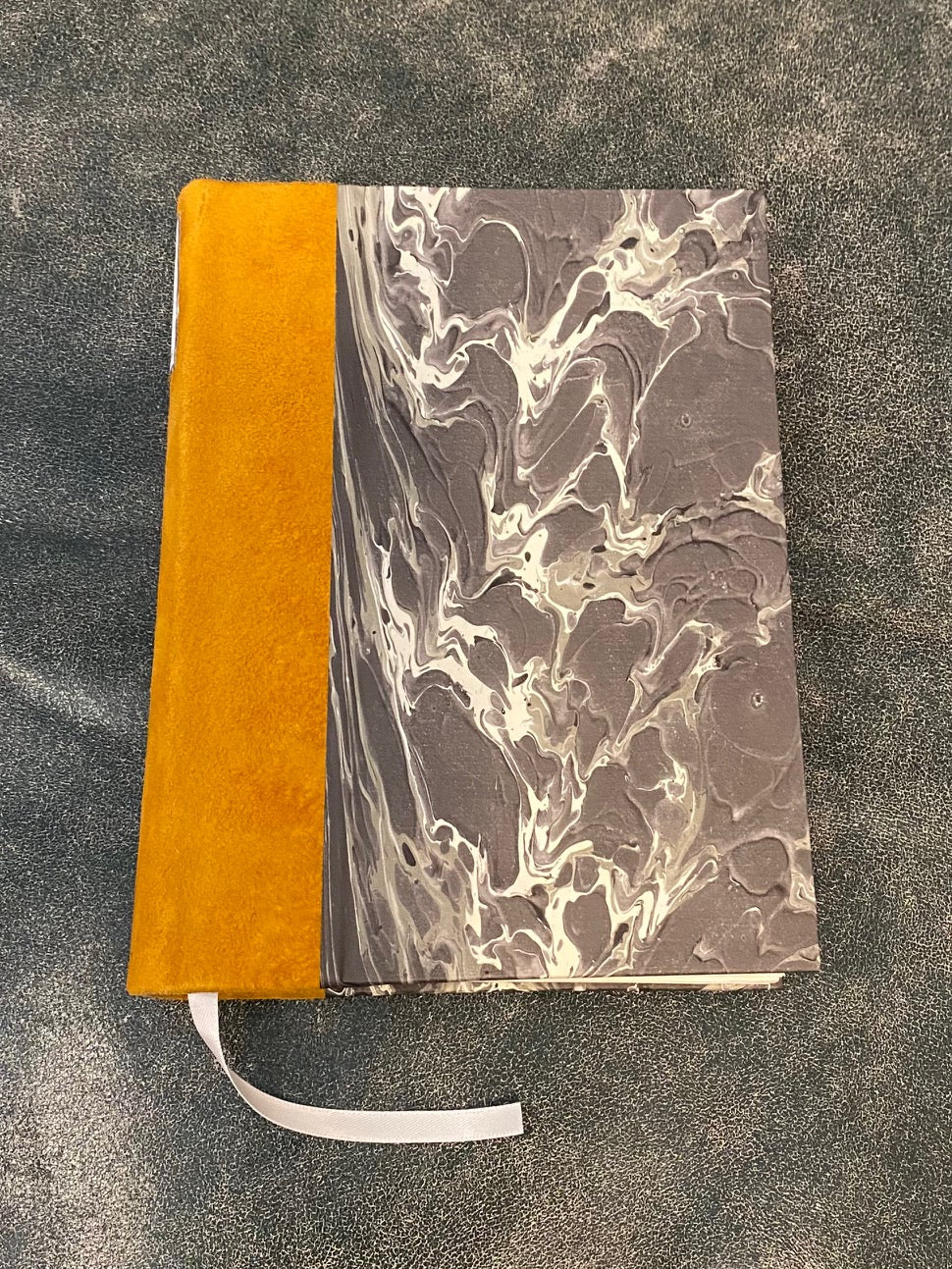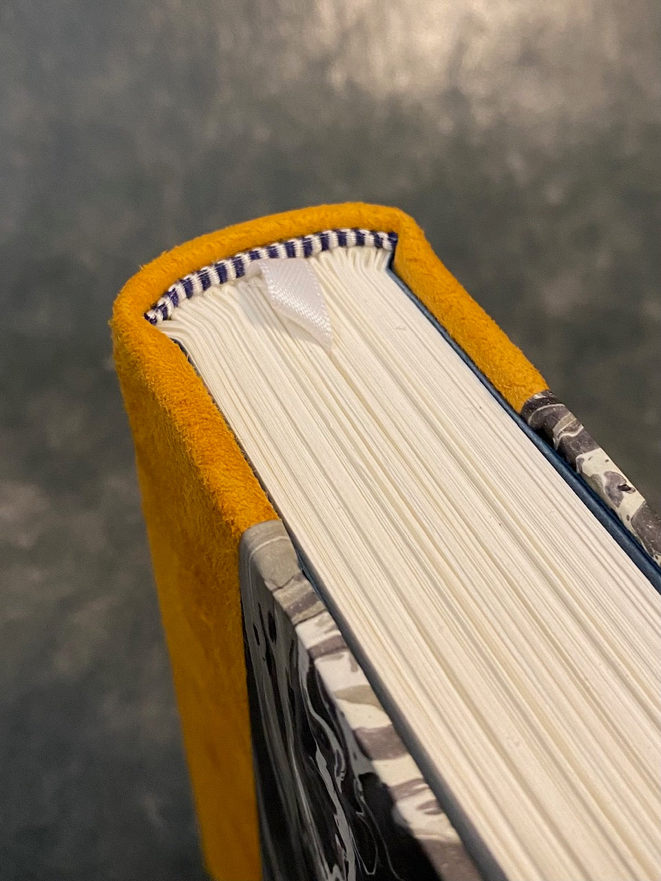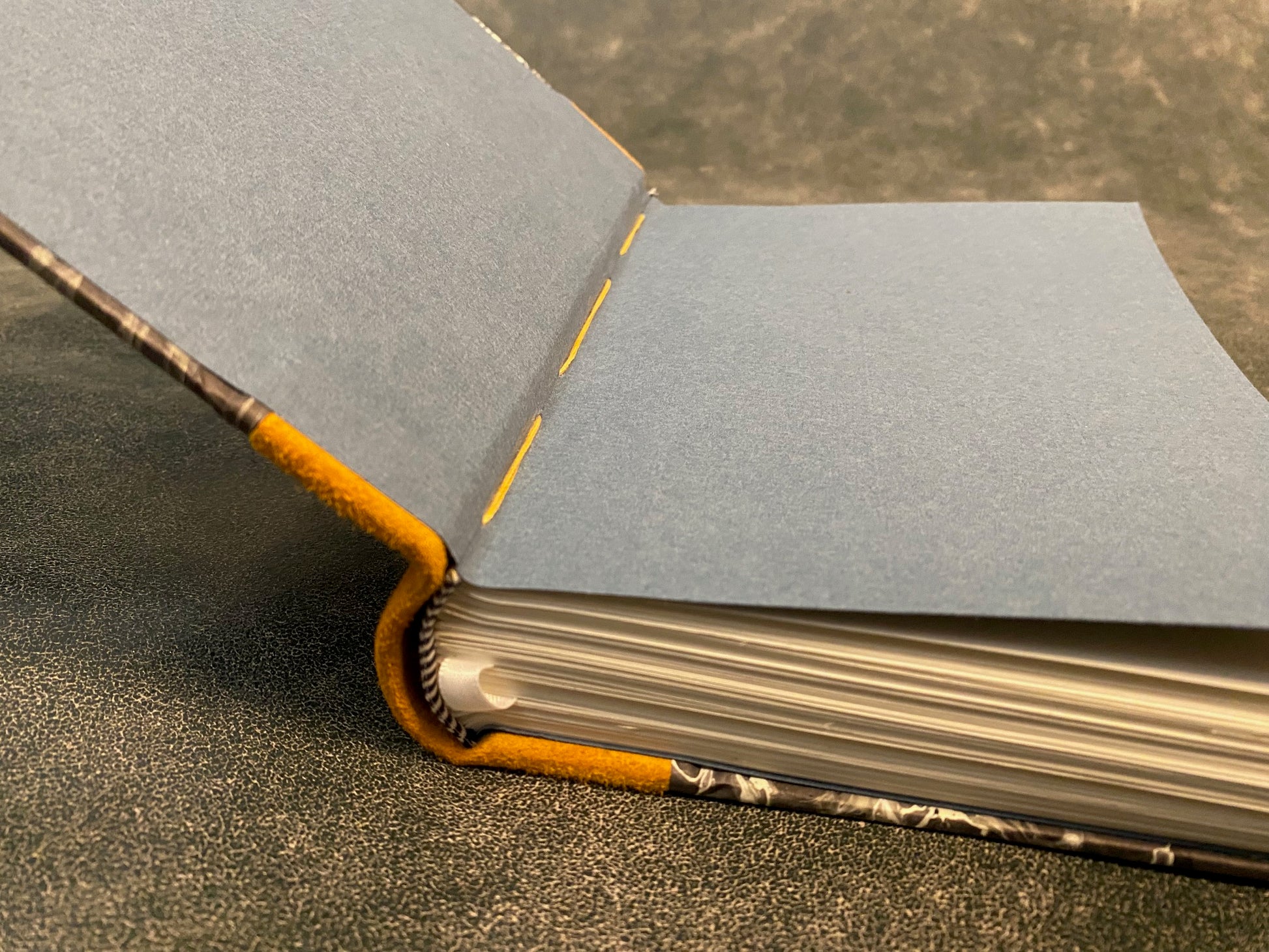 - Blue Bugra endpapers, high-quality mould-made paper from Hahnemuhle Mill, Germany