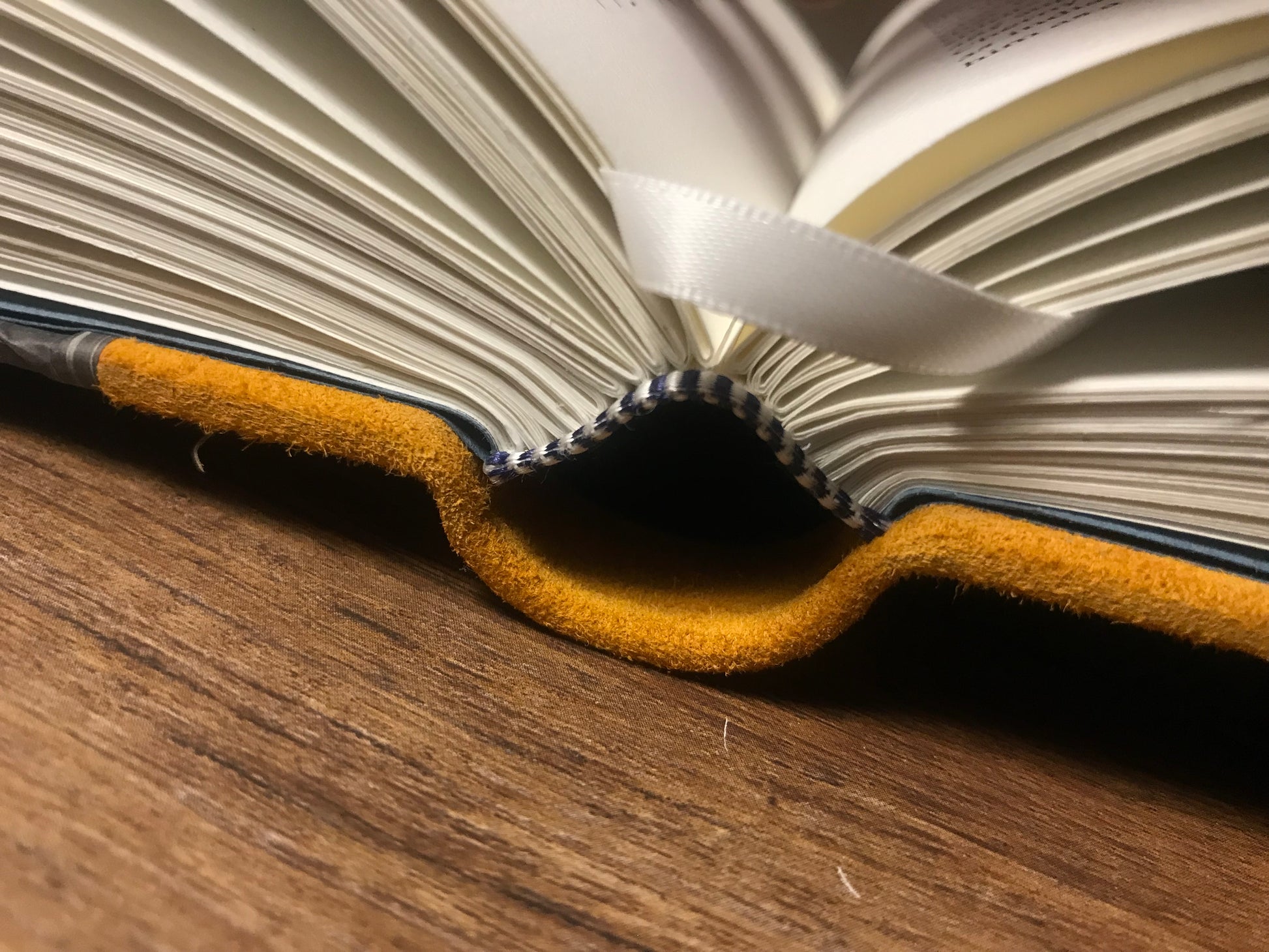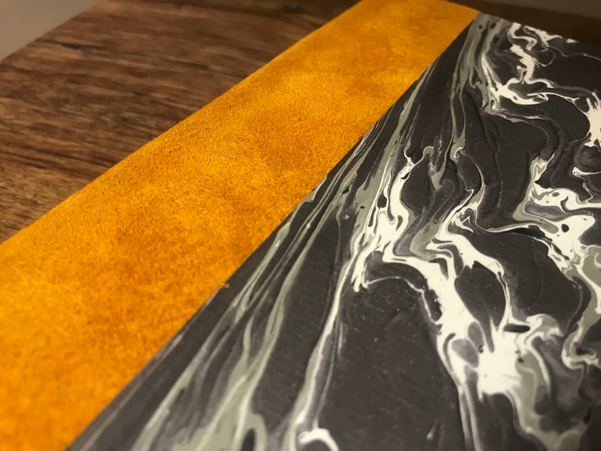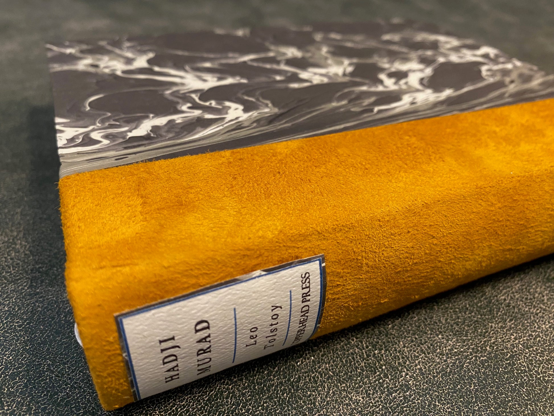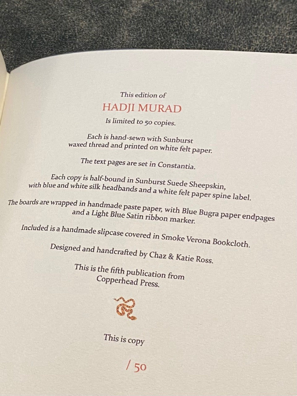 - Blue Bugra endpapers, high-quality mould-made paper from Hahnemuhle Mill, Germany