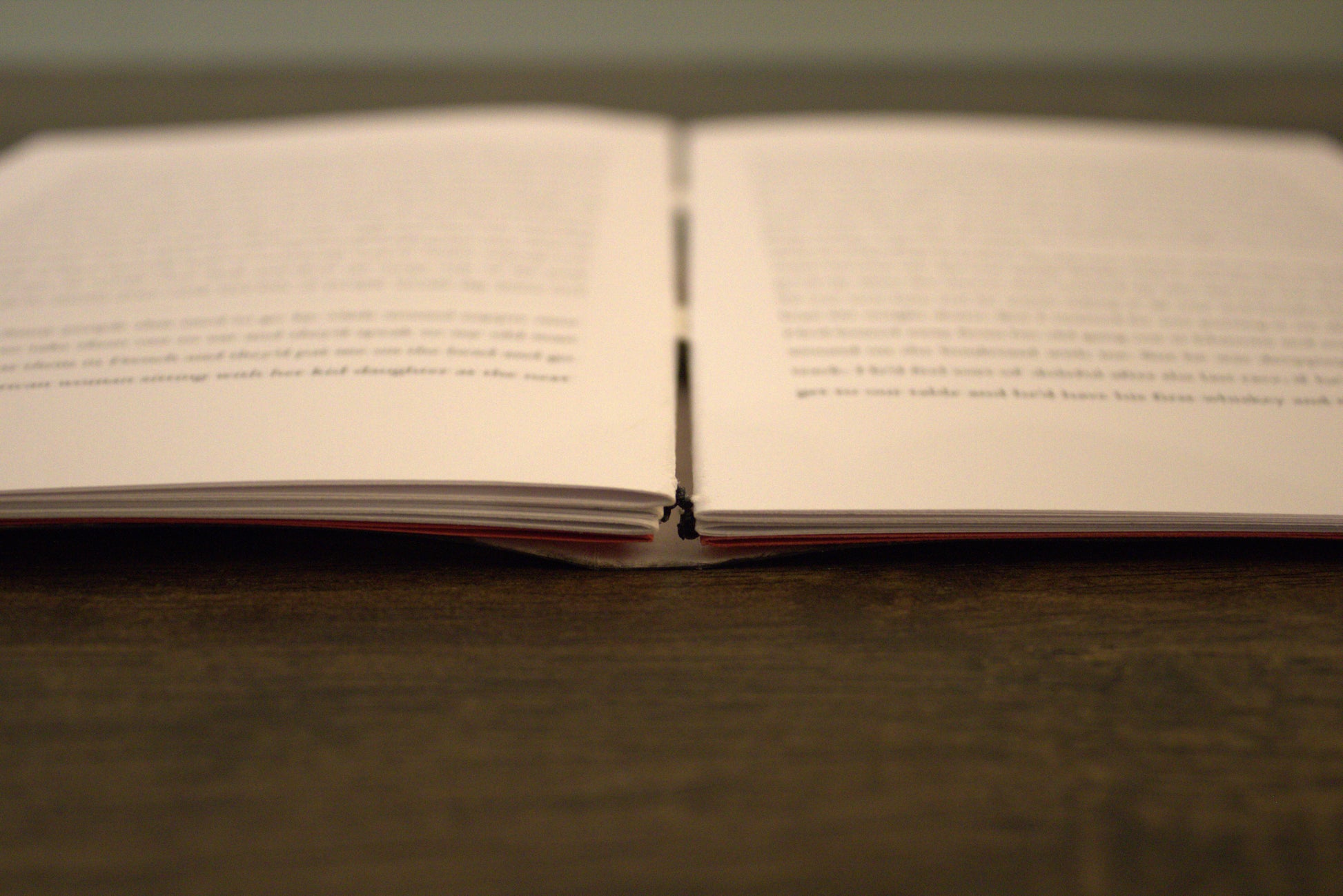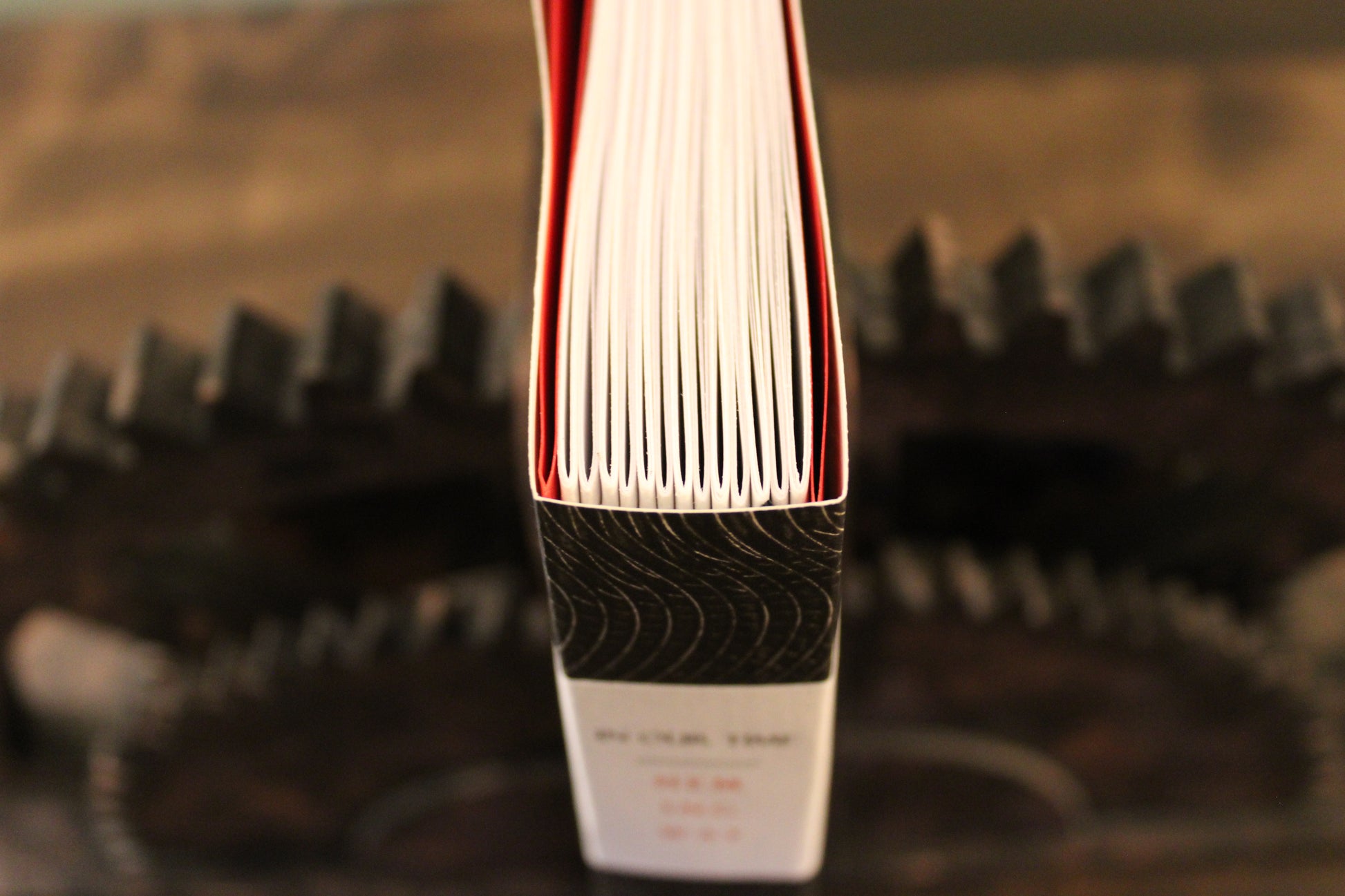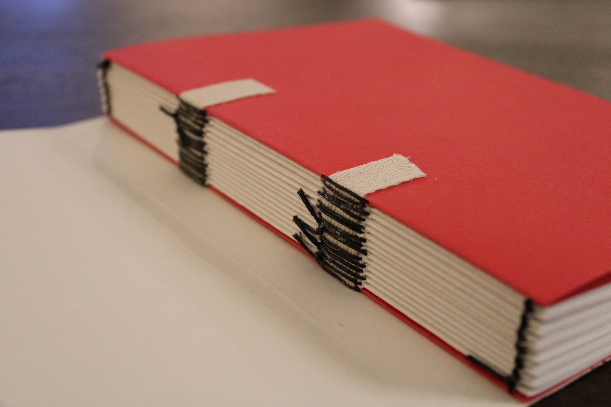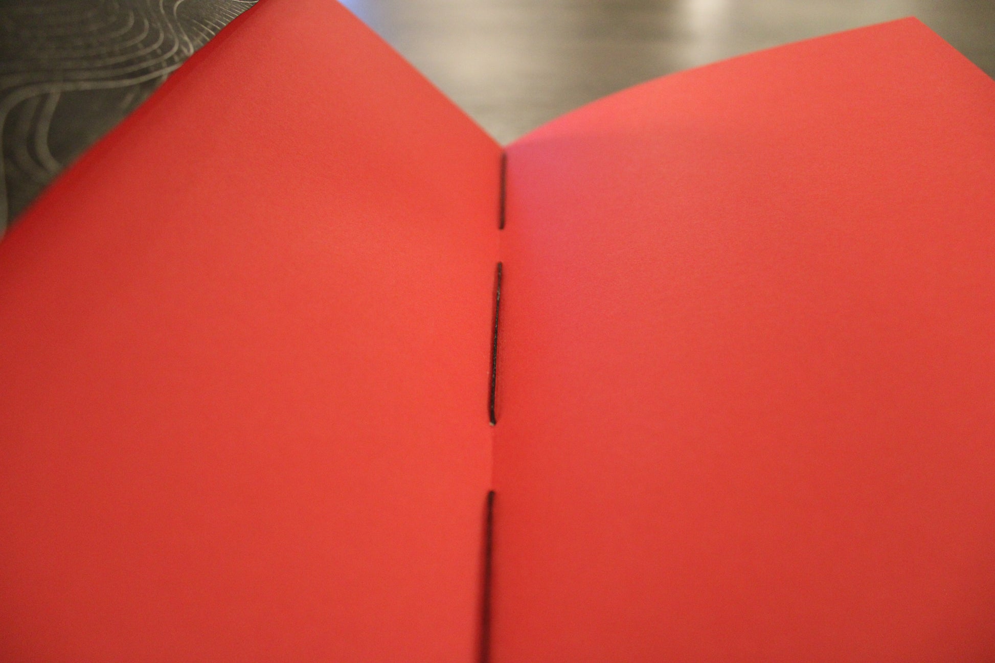 - Paste paper wrapper opens, revealing exposed stitching on the spine