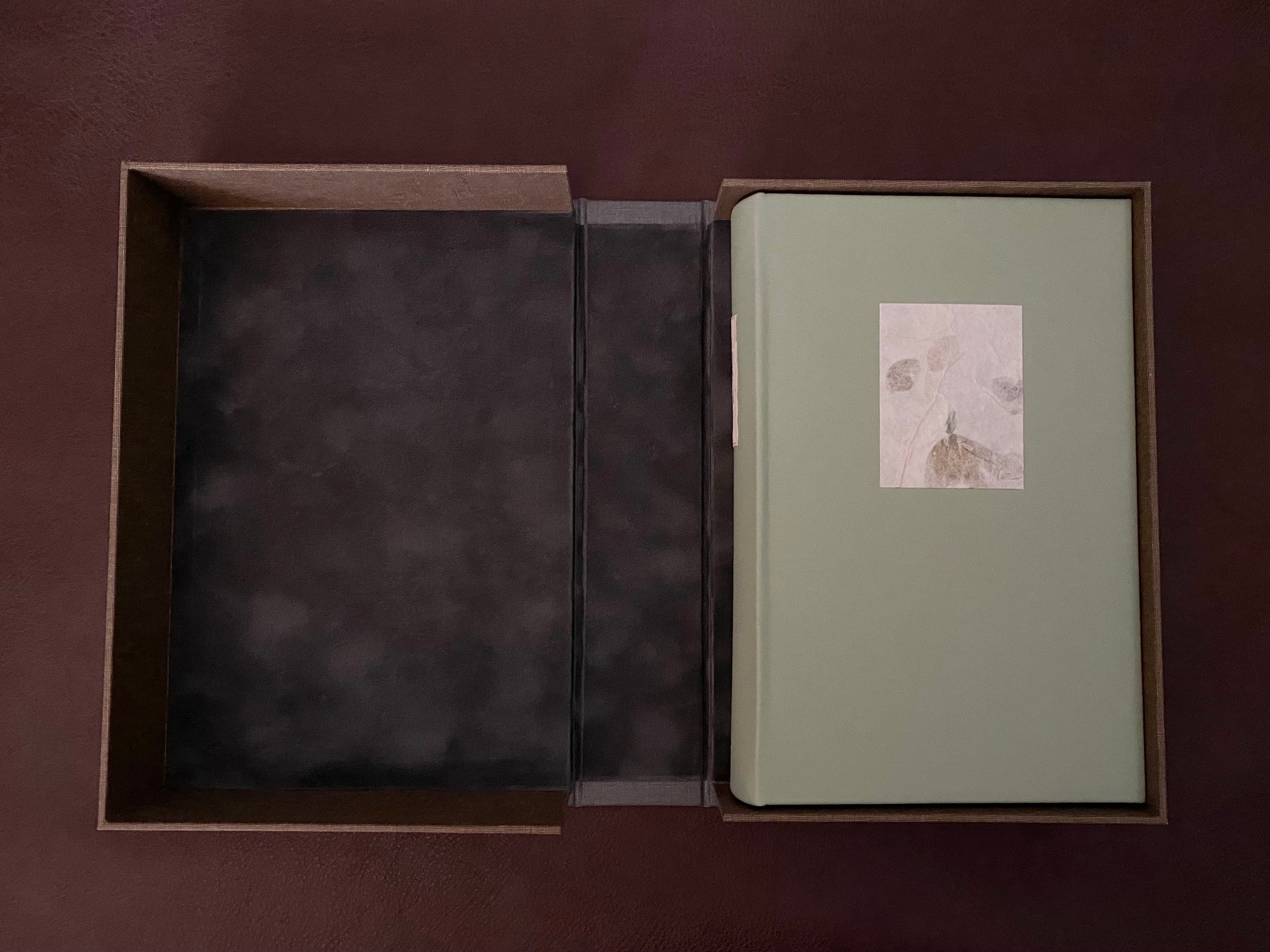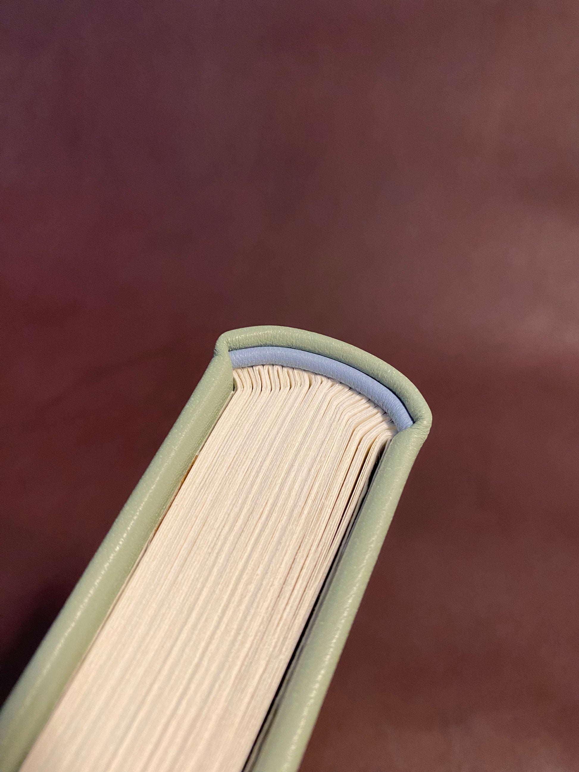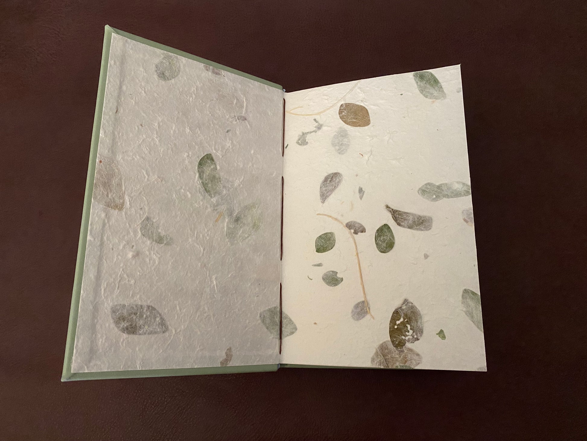 - Endpapers made from natural cotton paper with real leaf inclusions, sewn to the text block for extra strength