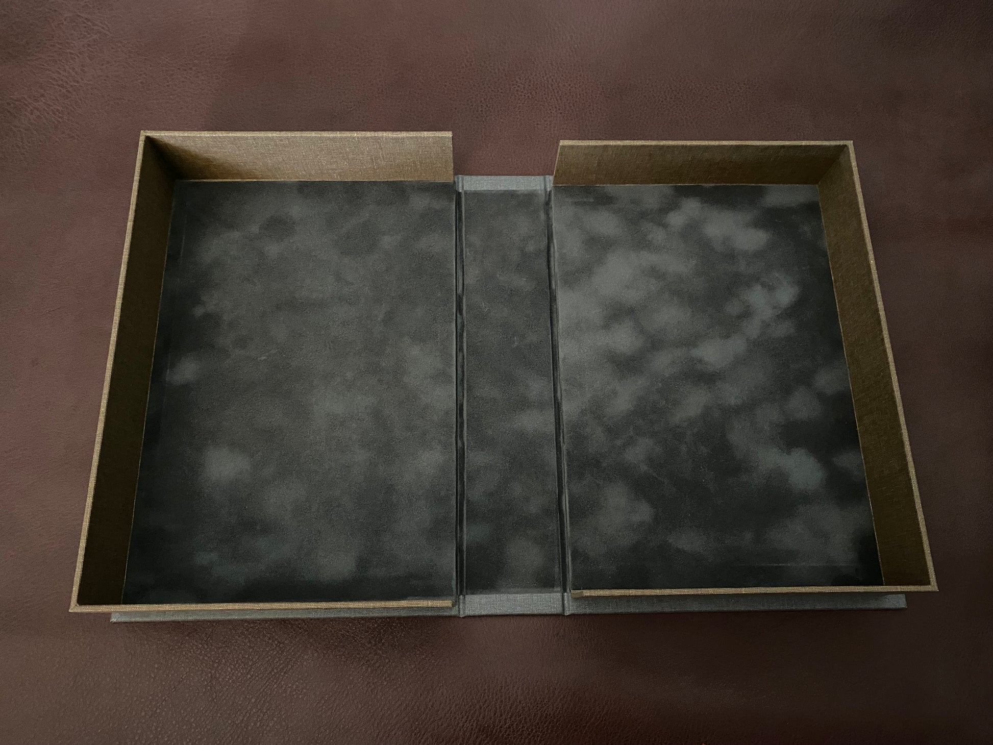 - Made from thick book board, covered in grey linen Brooklyn bookcloth