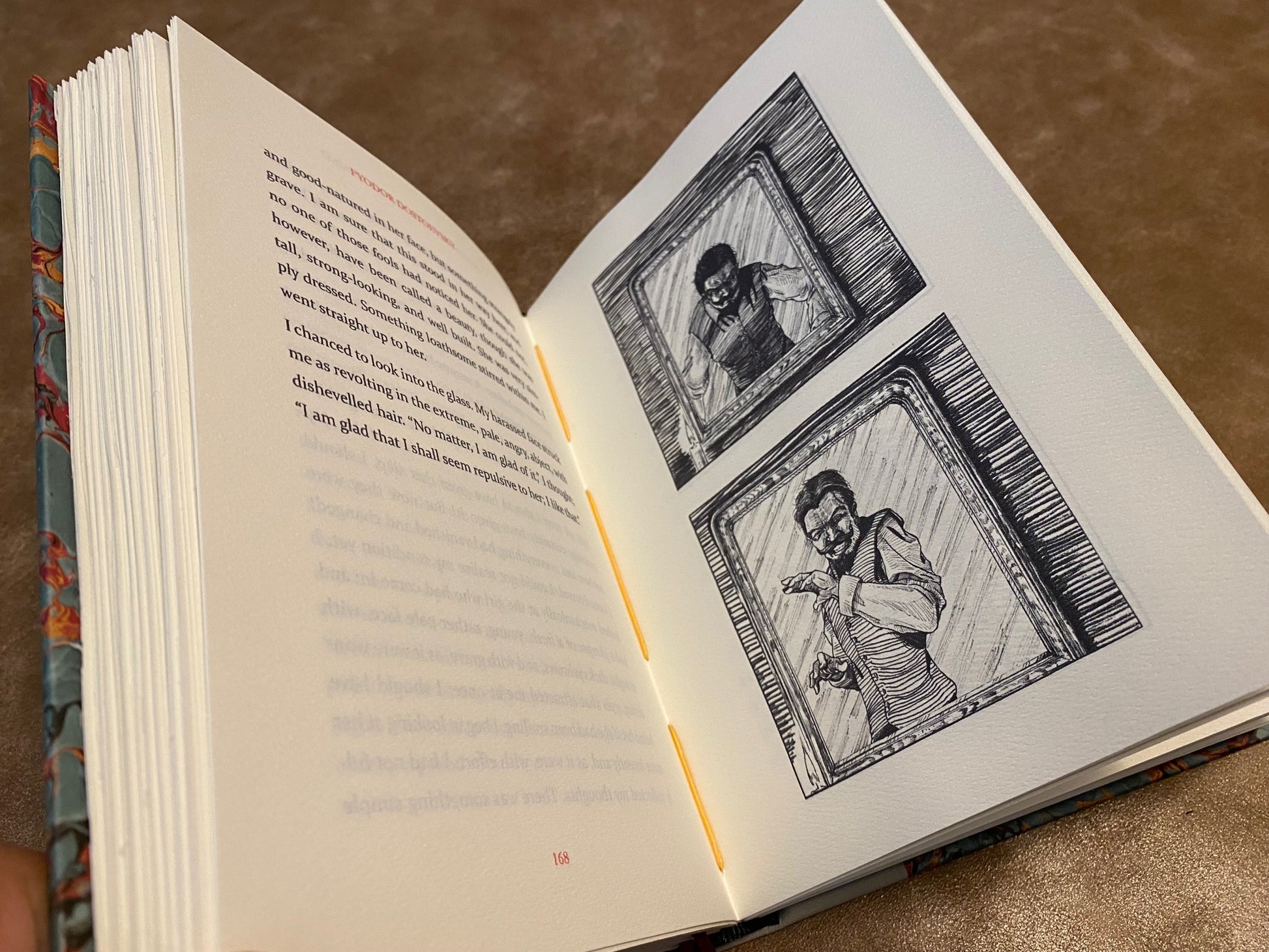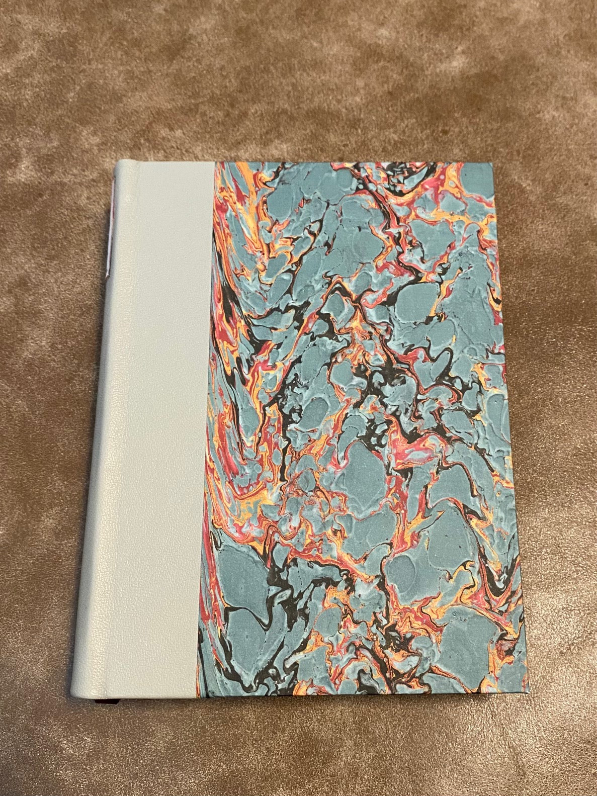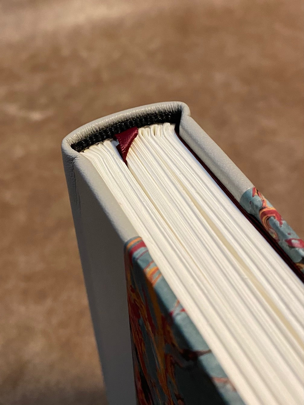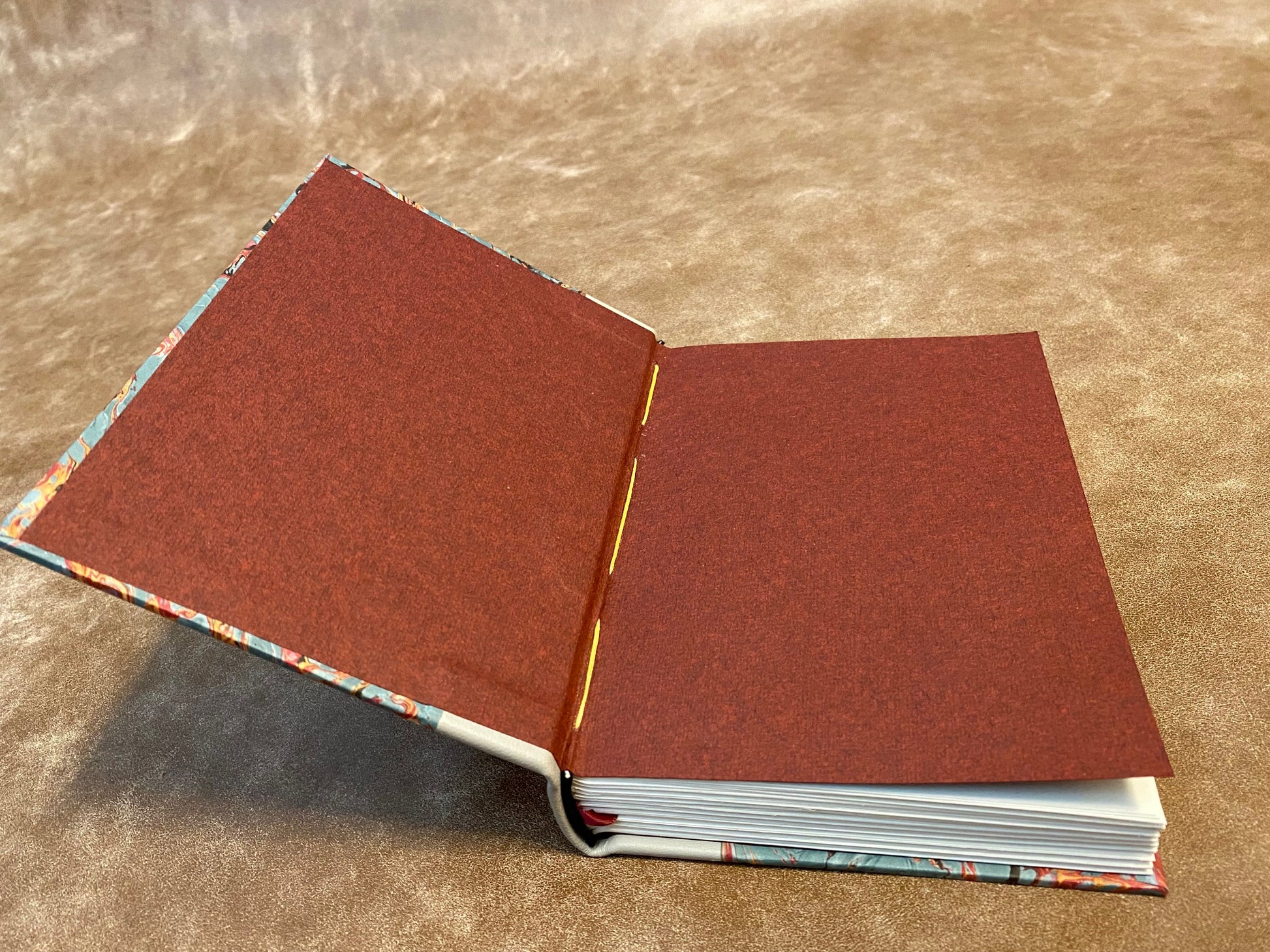 - Burgundy Bugra endpapers, high-quality mould-made paper from Hahnemuhle Mill, Germany