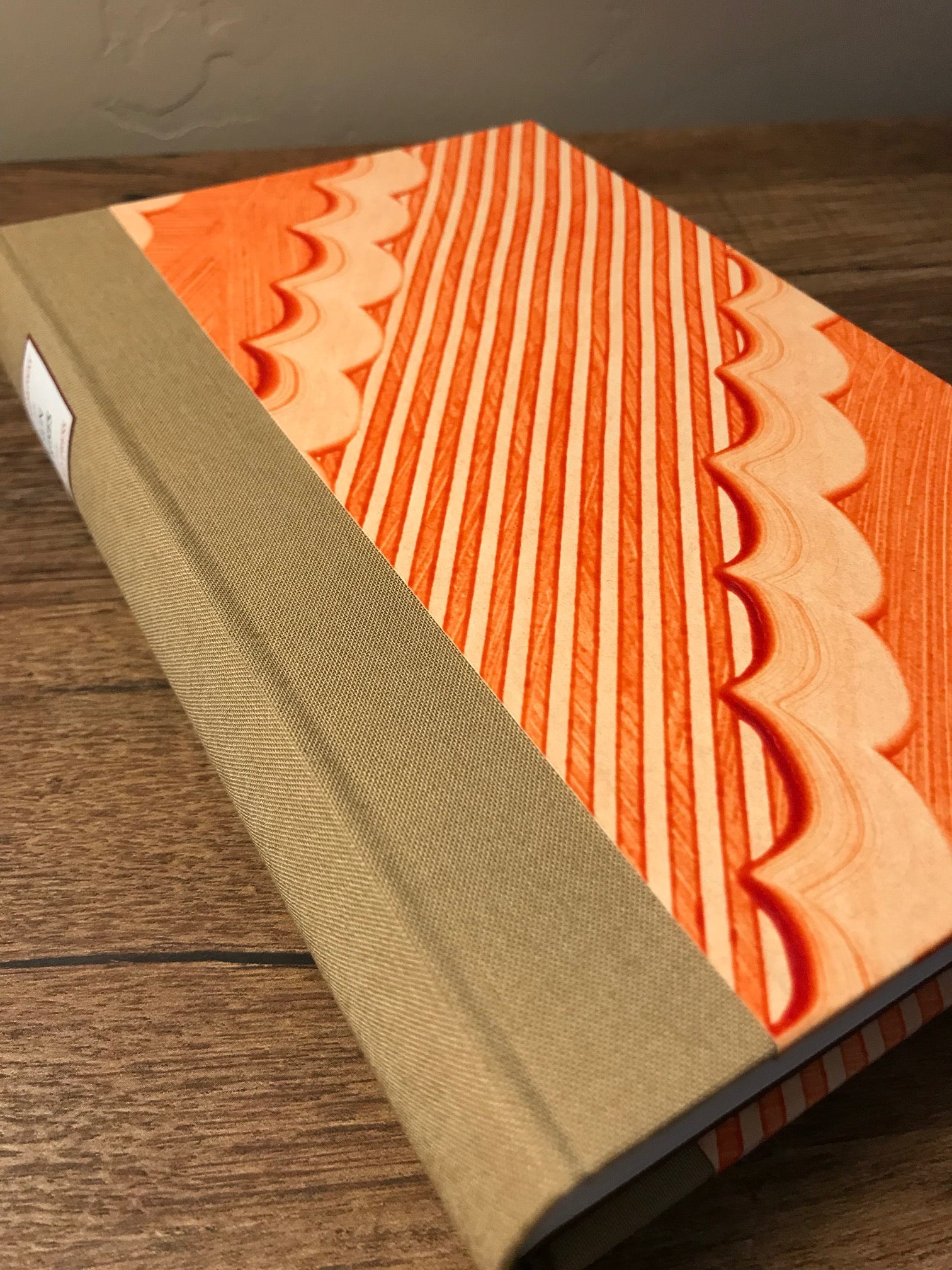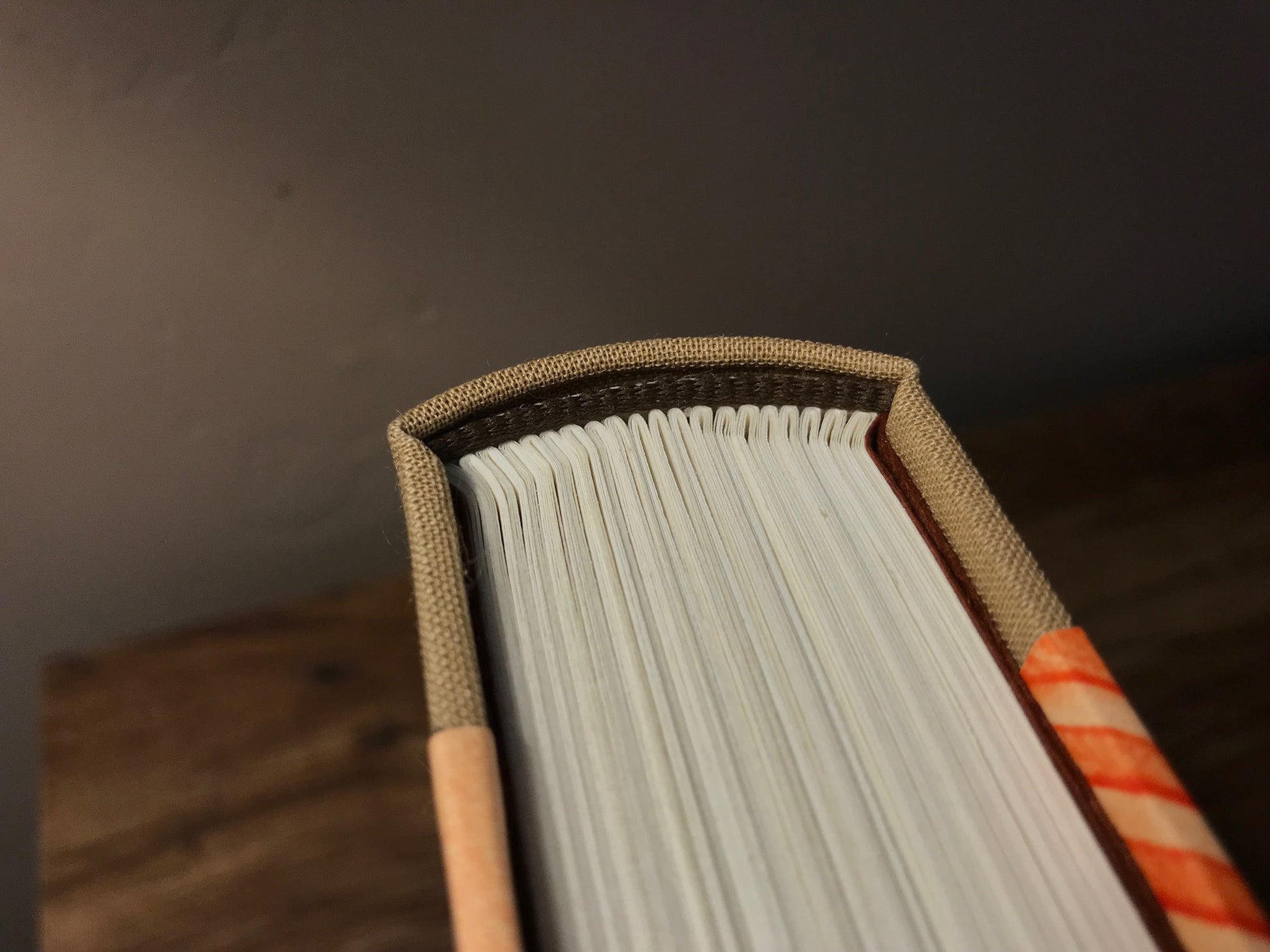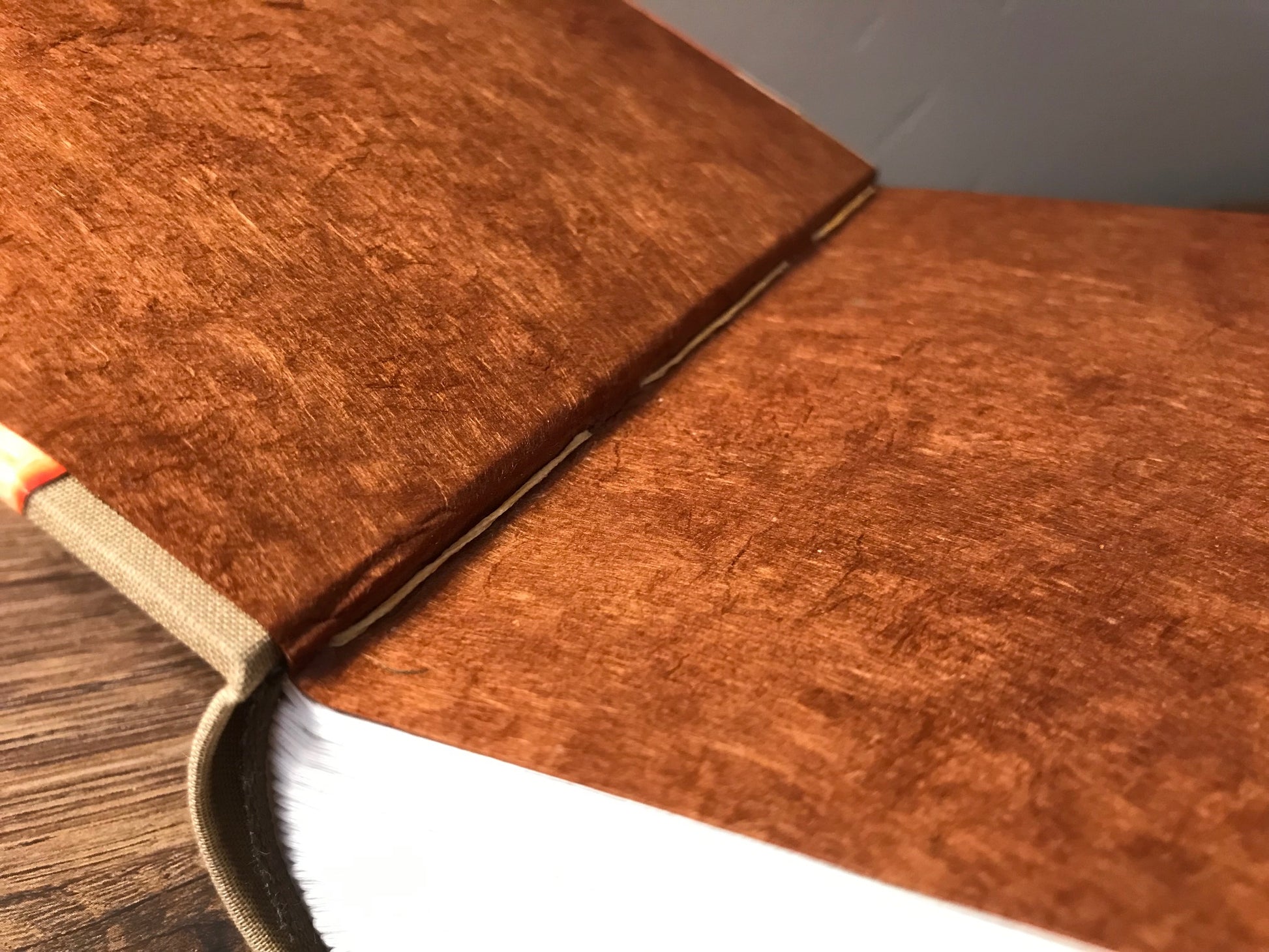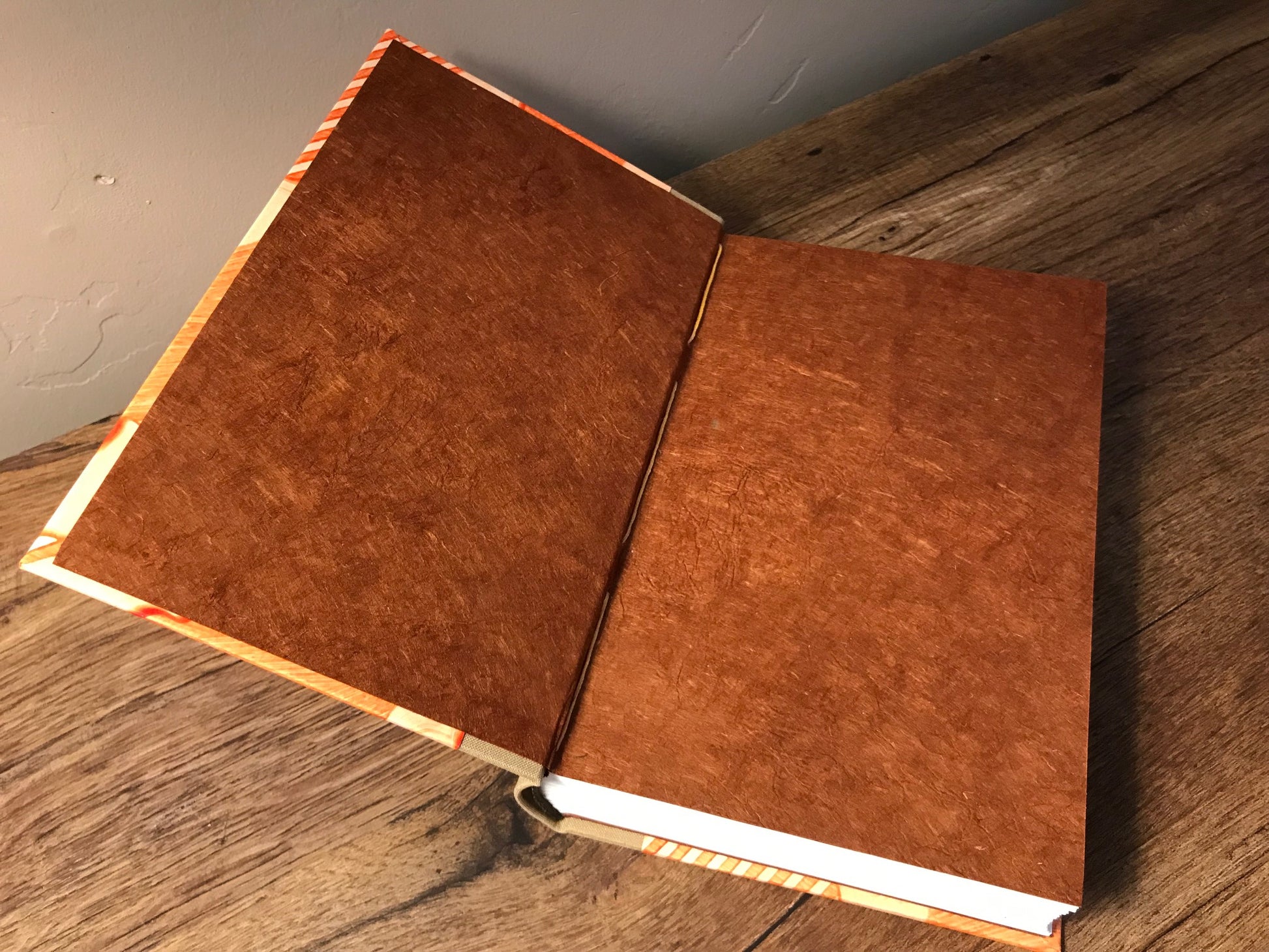 - Endpapers of terra cotta handmade Lokta paper, sewn to the text block for added strength