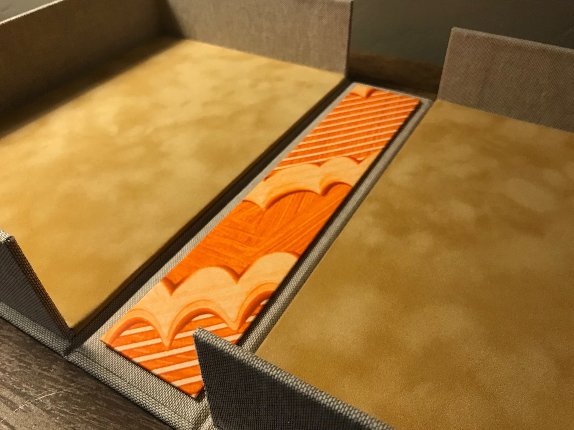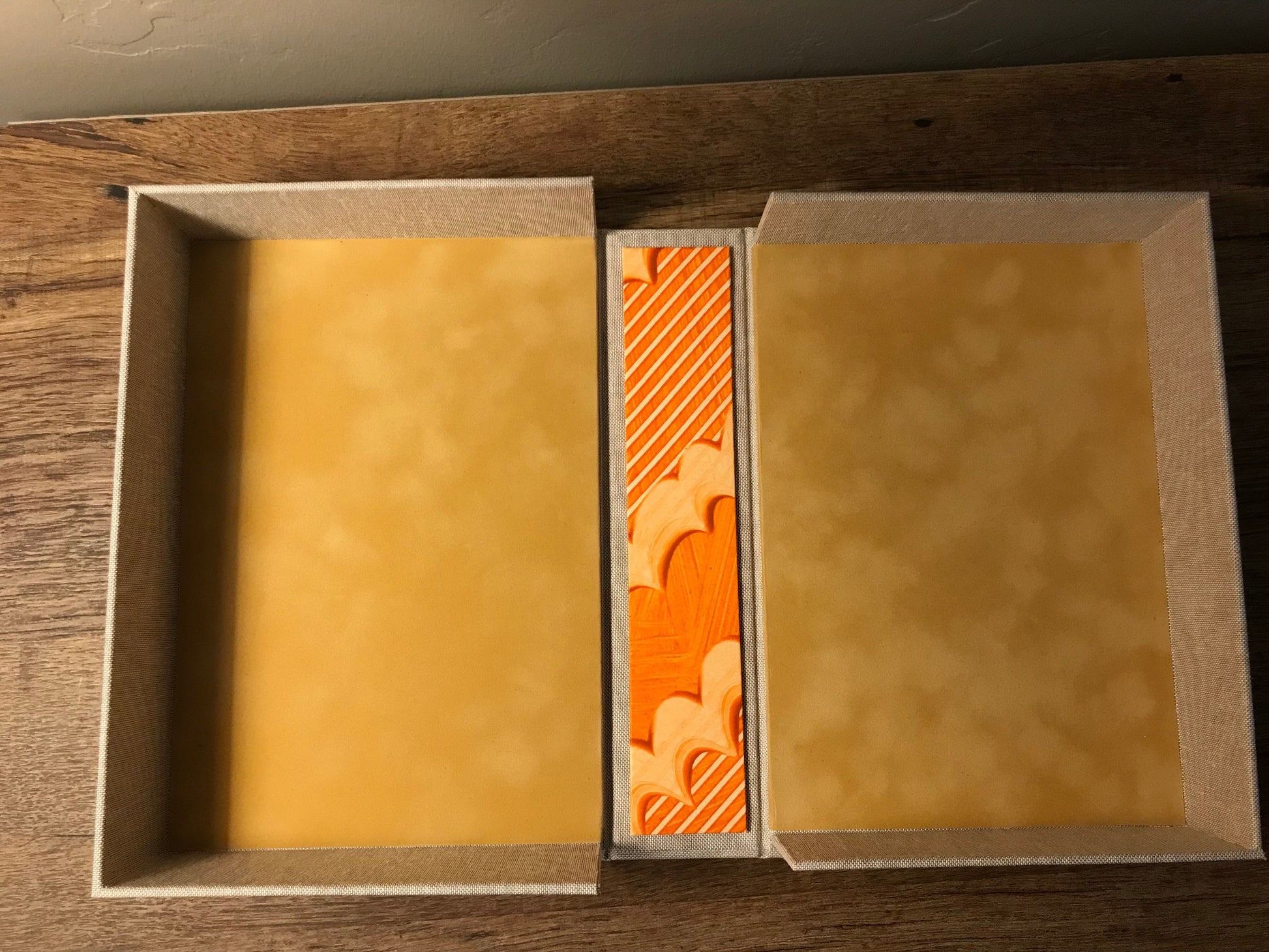 - Interior lined with honey suede cloth and spine piece covered in matching paste paper