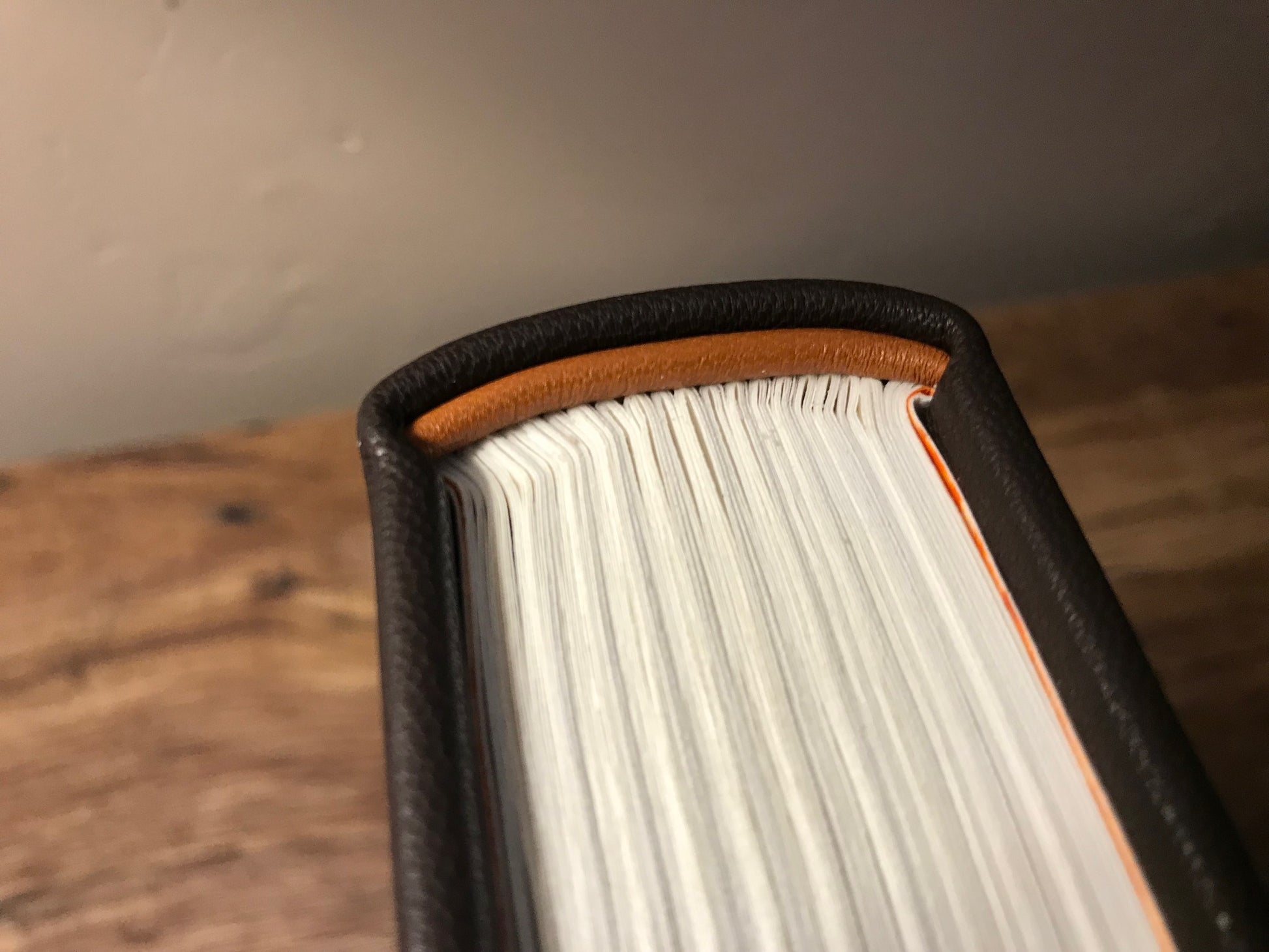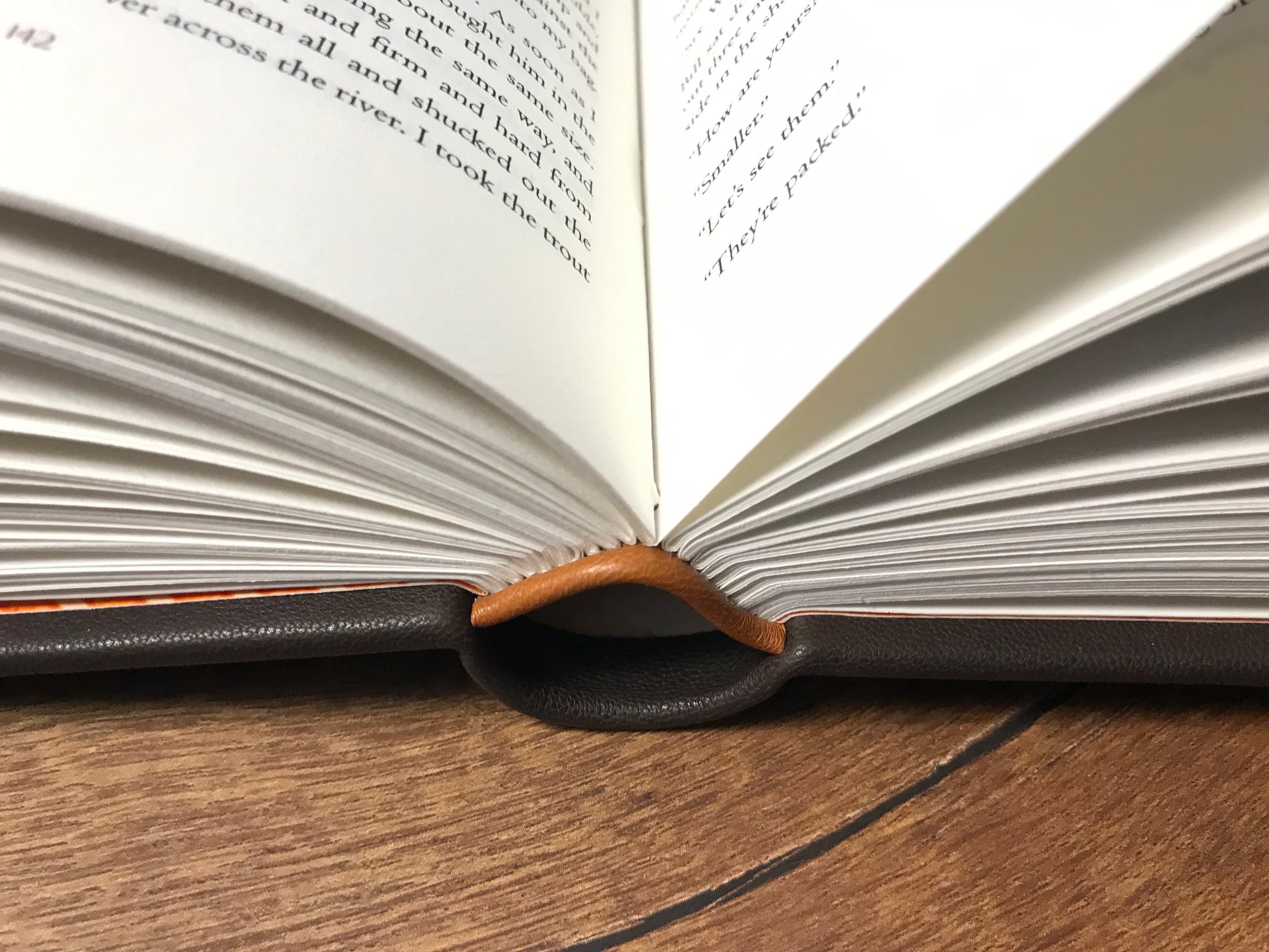 - Headbands made from cognac sheepskin leather, matching the spine tag